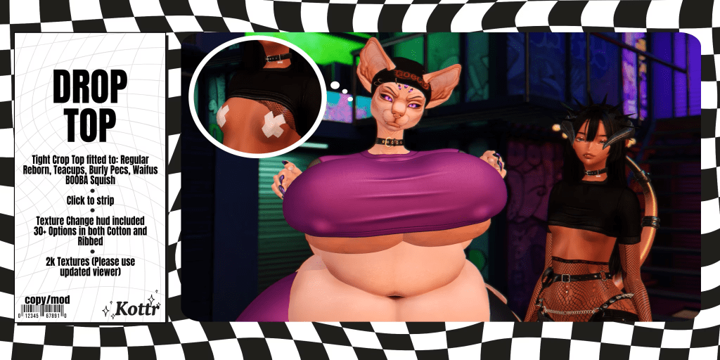 Today’s product is the Drop Top by Kottr! It felt appropriate to use a video clip for this one because this is an interactive top! While it looks like a cute, basic crop top on the surface, this bad boy is equipped with animations to lift the top and drop it back down. It also includes a full tiddy drop/bounce and sound effects to match!